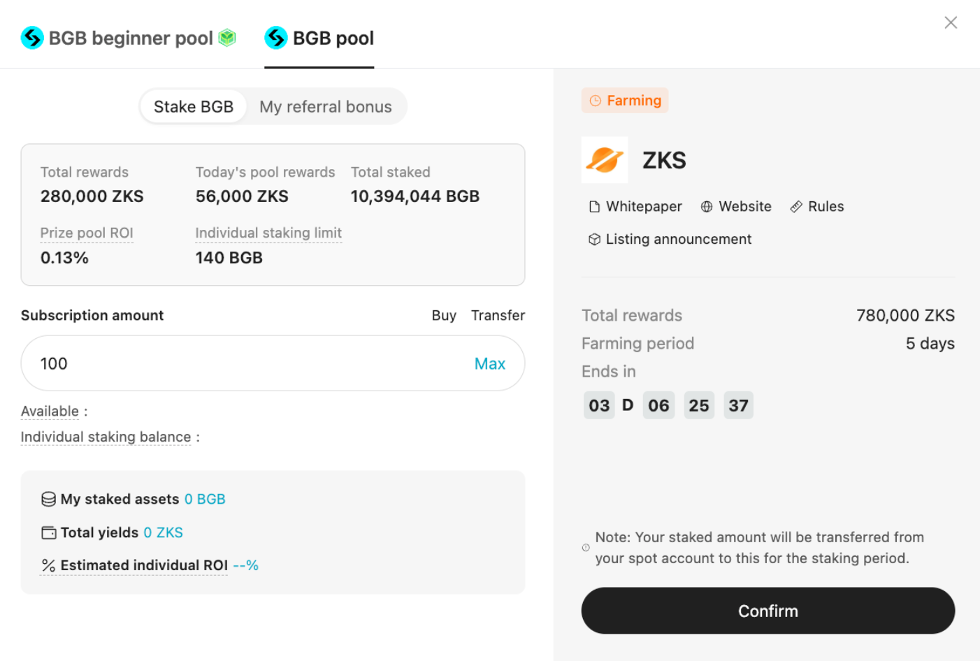 참여를 원하는 풀로 이동해주신 다음, 아래와 같이 청약할 코인의 수량을 'Subscription amount' 부분에 입력해주세요. 다음으로 'Confirm'을 누르면 비트겟 런치풀 참여가 완료됩니다. 간단하죠?