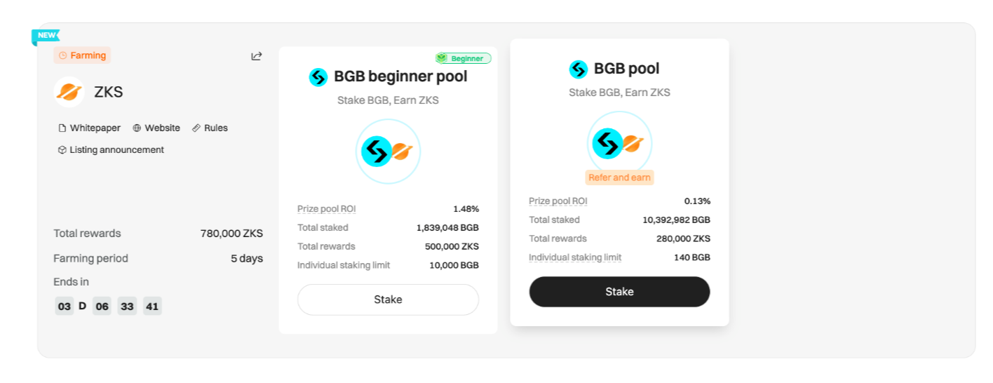 예를 들어, 아래와 같이 진행 중인 런치풀 프로젝트가 있을 것입니다. 'BGB beginner pool'은 신규 유저 풀이며, 'BGB Pool'은 BGB 코인을 보유하고 있는 사용자를 대상으로 진행되는 런치풀입니다.