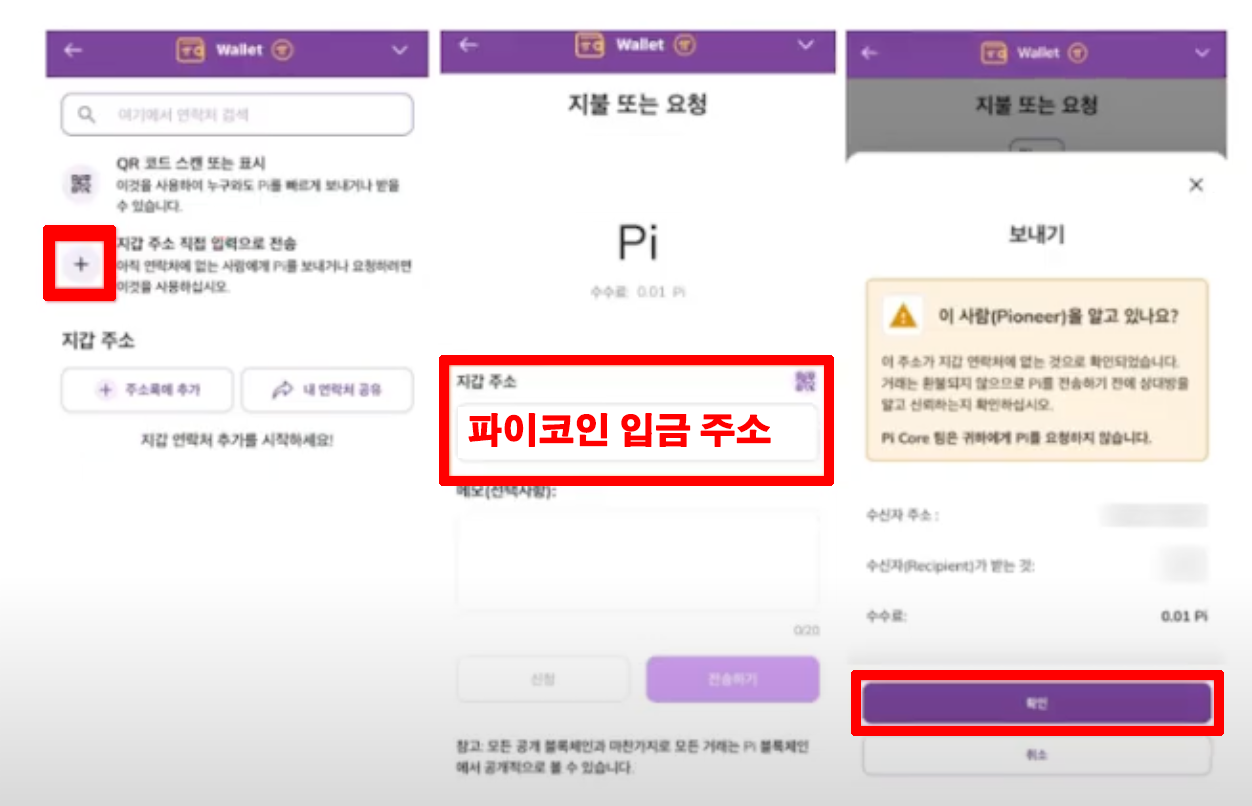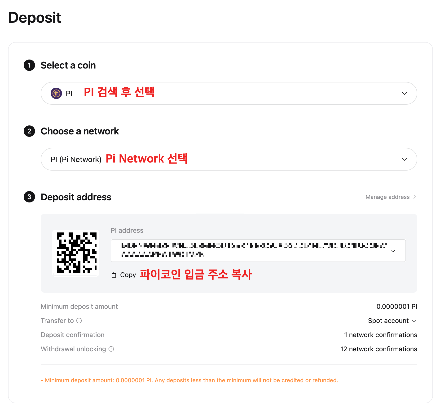 입금 주소는 반드시 파이코인 전용 주소여야 하며, 다른 코인 입금 주소 또는 잘못된 주소를 붙여넣게 될 경우 파이코인을 잃어버리게 될 수 있으므로 다시 한 번 확인해보세요.