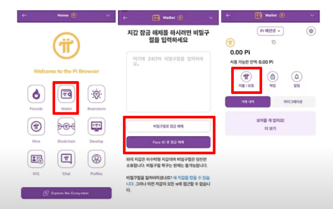 비트겟 이벤트 참가 신청을 모두 마치셨나요? 이제 파이 네트워크 앱을 실행하고, ‘Wallet’ 메뉴로 이동해주세요. 지갑 잠금을 해제하신 다음, 아래와 같이 '지불/요청' 메뉴를 선택하여 비트겟으로 코인을 전송할 수 있습니다.