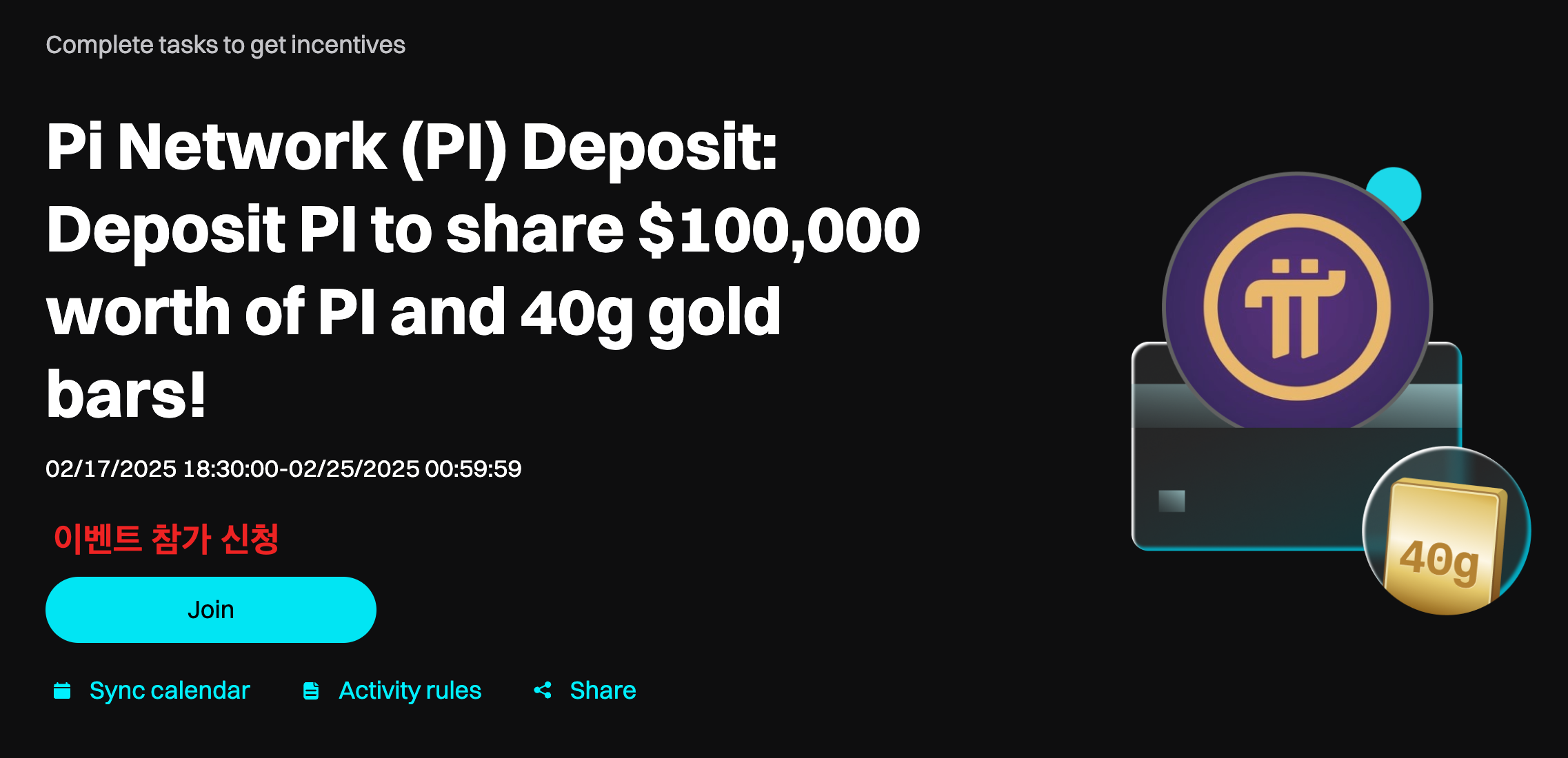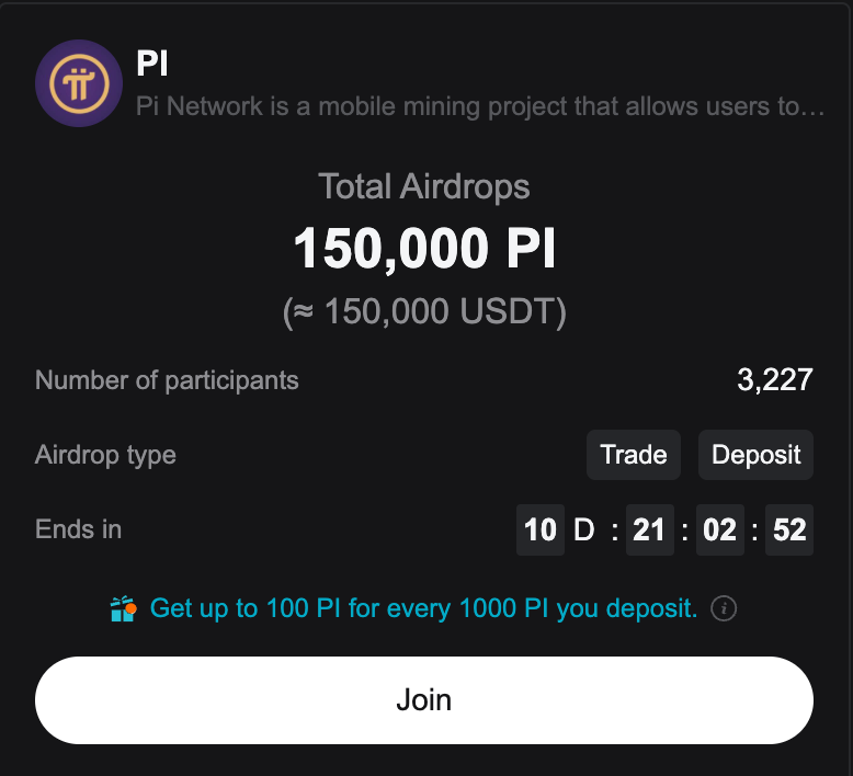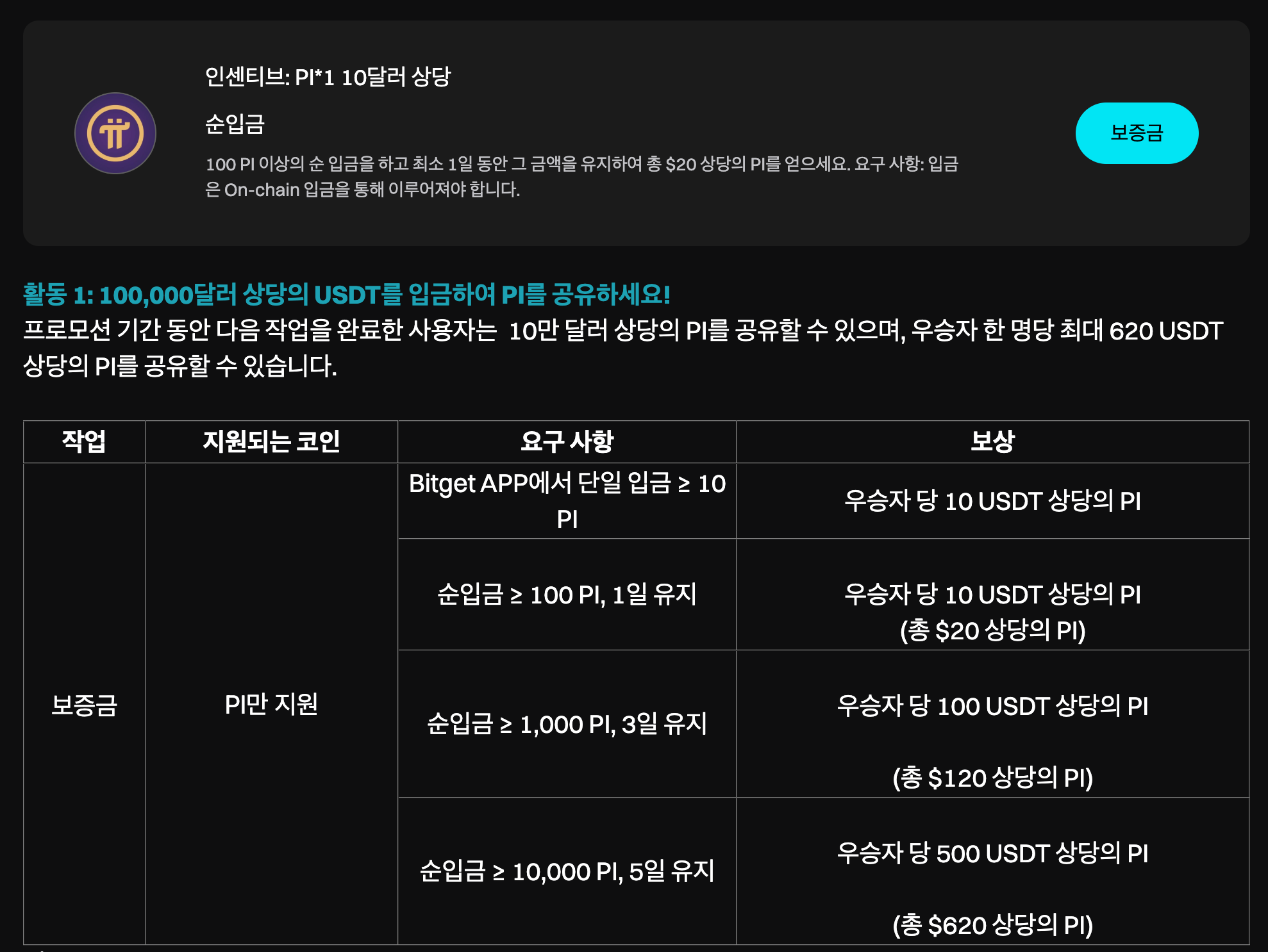 비트겟은 파이코인 상장을 기념하여 총 150,000 $PI 보상을 제공합니다. 다음 링크를 통해 비트겟 캔디밤 페이지로 이동한 다음, 참가 신청('Join')을 클릭해주세요. 비트겟에 파이코인을 입금하고 거래하면 개인당 최대 1,100 $PI 코인을 보상을 받으실 수 있습니다.