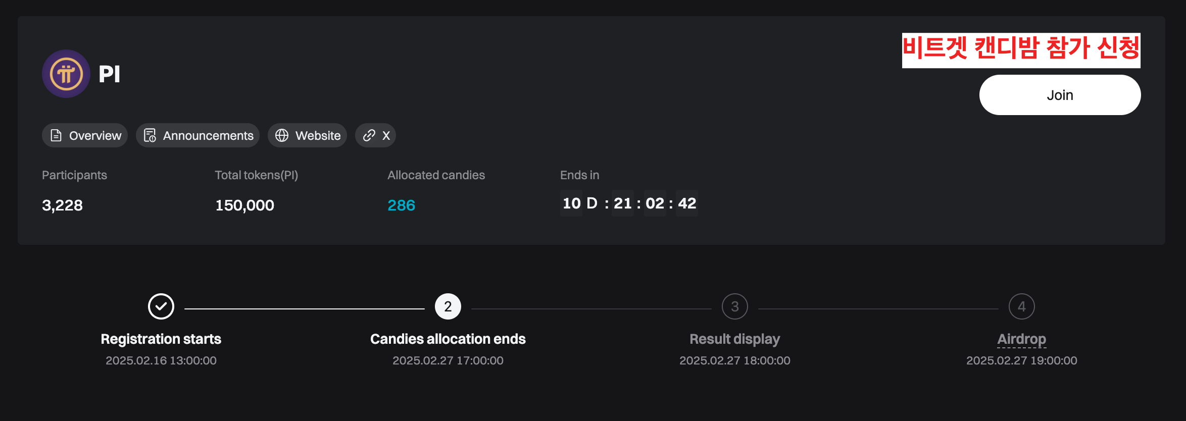 비트겟의 캔디밤은 특정 미션을 수행하면 "캔디" 보상을 획득할 수 있는 이벤트입니다. 이번 이벤트에서는 총 150,000 $PI가 에어드랍될 예정이며, 입금 및 현물(Spot) 거래 미션을 완료하면 최대 100 $PI를 추가로 받을 수 있습니다. 반드시 이벤트 참가 신청을 먼저 하시고, 파이코인을 입금해야 추가 보상을 받을 수 있다는 점에 유의하세요!