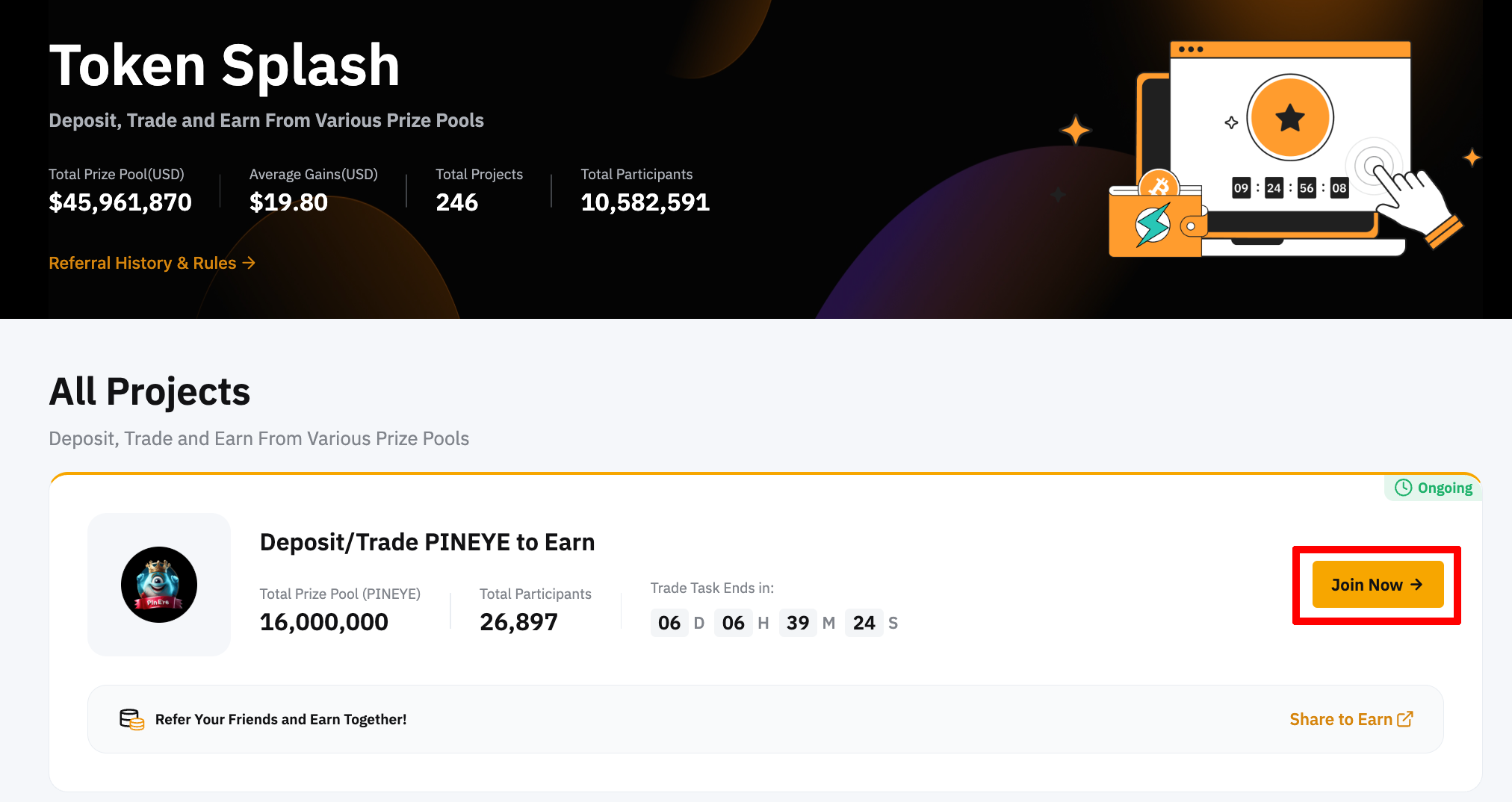 토큰스플래시 페이지에 접속하면 아래와 같이 이벤트가 진행 중인 프로젝트를 확인할 수 있습니다. 여기에서 보상 풀의 규모와 참가자 수, 이벤트 종료까지 남은 시간 등이 표시되는데요.