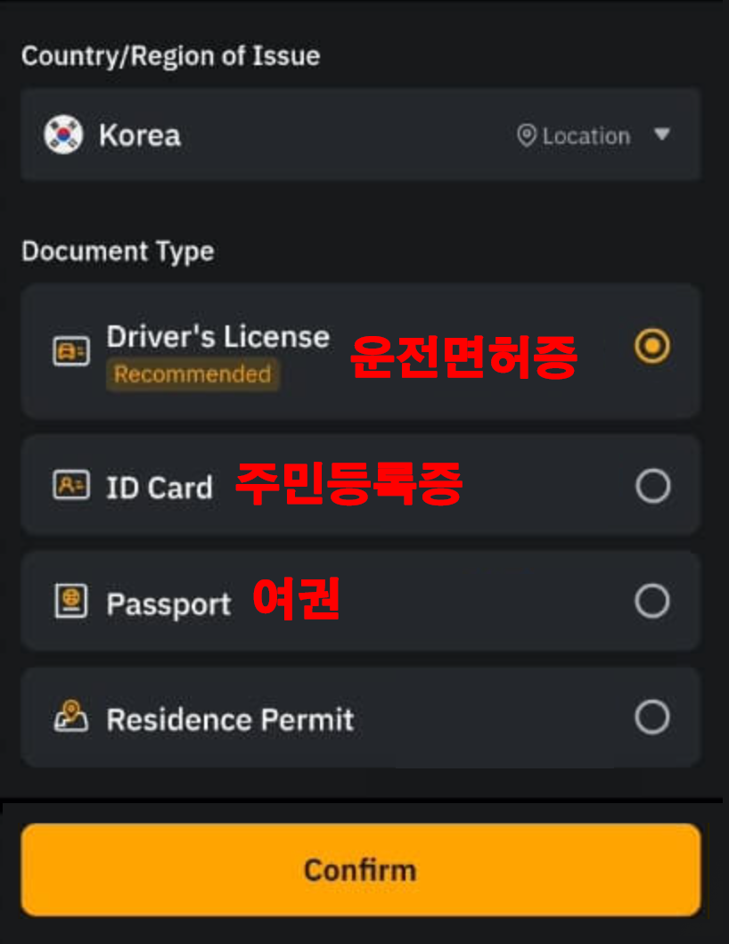 국적에 해당하는 'Korea'를 선택하고, 사용 가능한 신분증을 선택해주세요. 운전면허증이나 주민등록증 또는 여권을 이용하실 수 있는데요. 이 중에서도 가장 간편한 인증 방법인 운전 면허증을 추천드립니다.