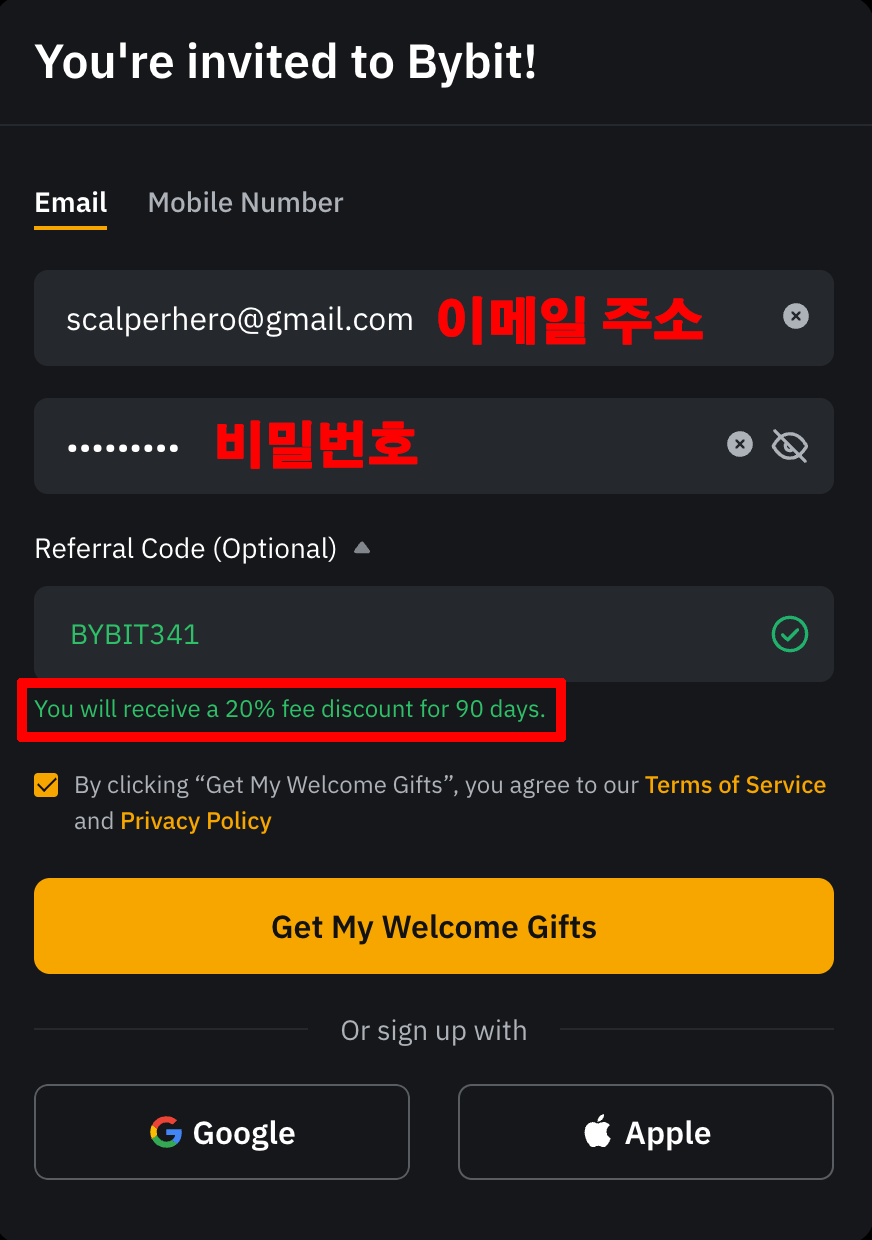 다음으로 바이비트 거래소 초대 코드 BYBIT341와 아래의 수수료 할인 문구 "You will receive a 20% fee discount for 90 days"를 확인해주세요.