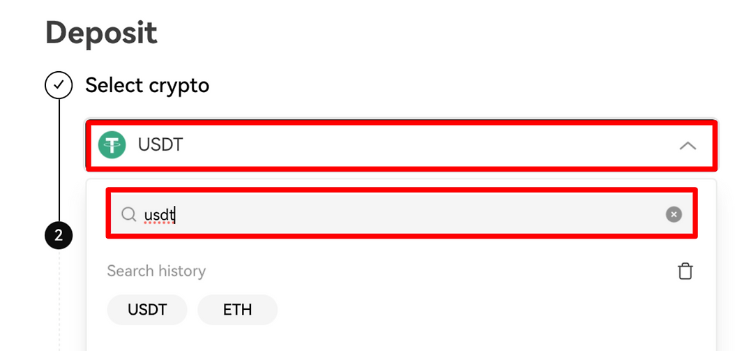 입금할 가상자산을 선택합니다. USDT, BTC, ETH 등이 대표적이며, 일반적으로 수수료가 낮고 속도가 빠른 USDT 사용이 권장됩니다.